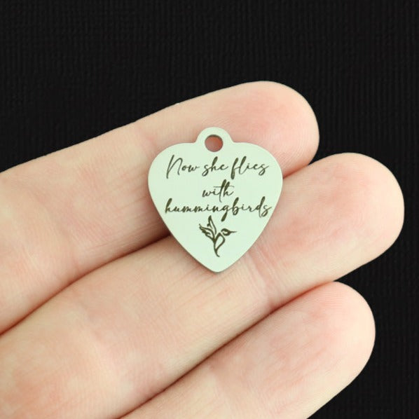 "Now she flies with hummingbirds" laser engraved stainless steel heart charms with hummingbird image, from our exclusive line designed by Bohemian Findings.