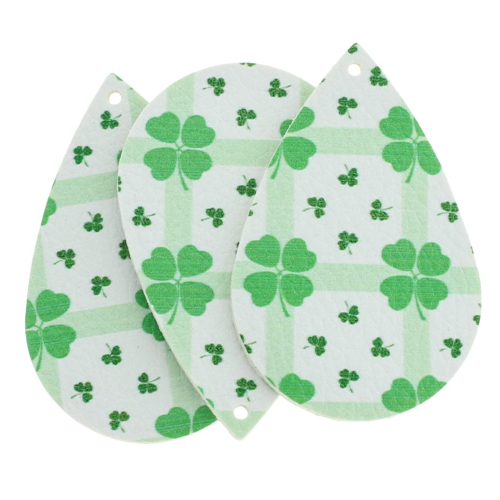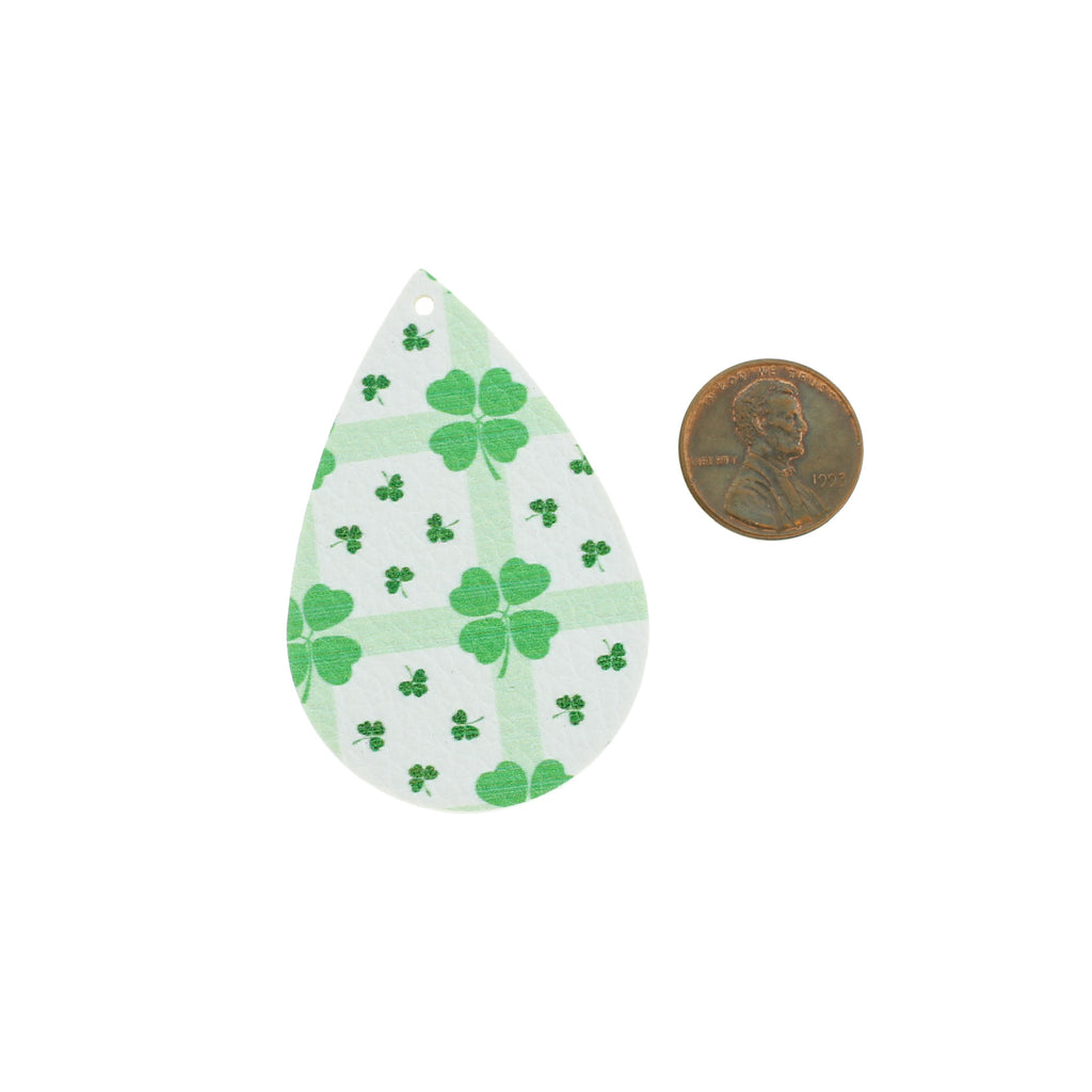 White teardrop pendants with four leaf clovers, in imitation leather.