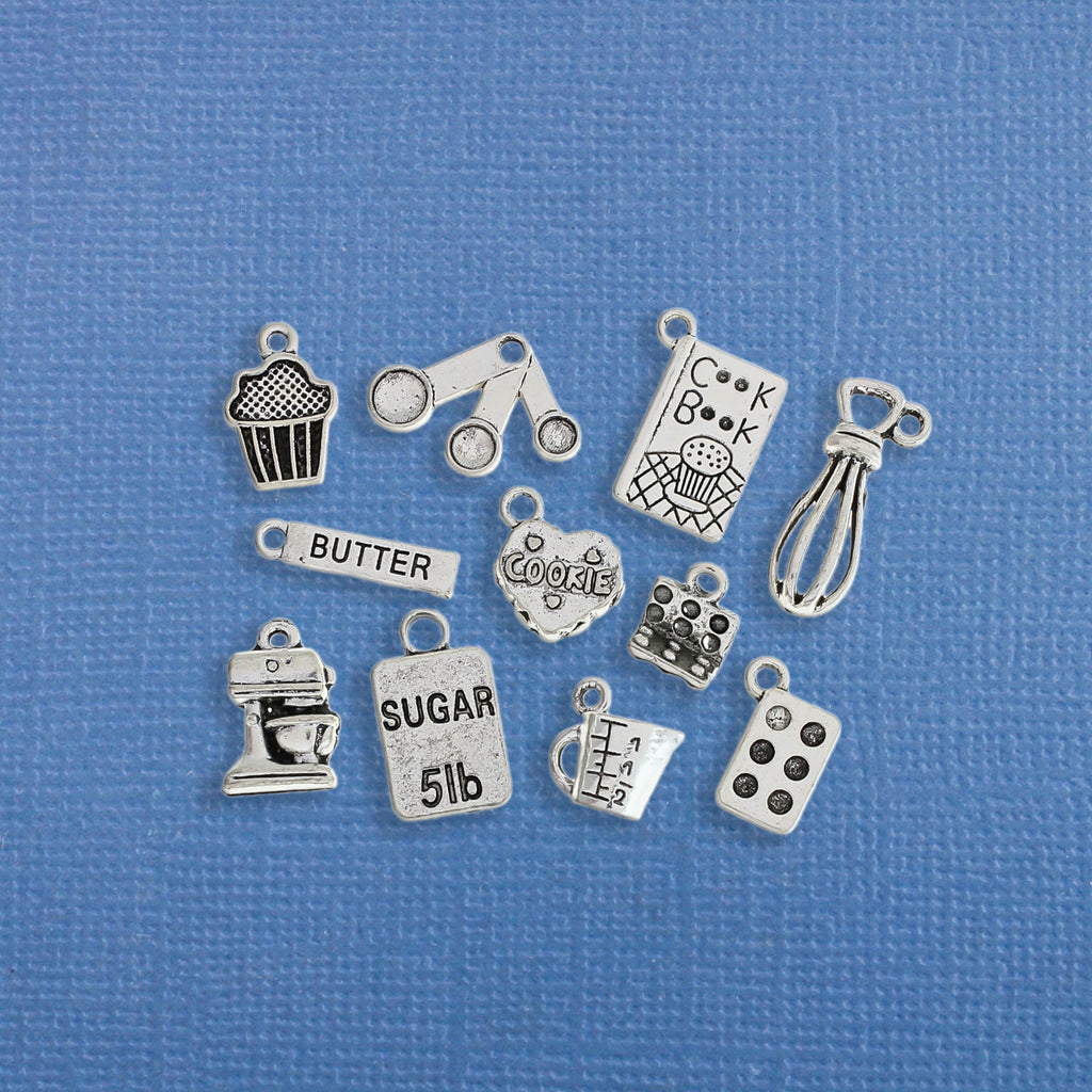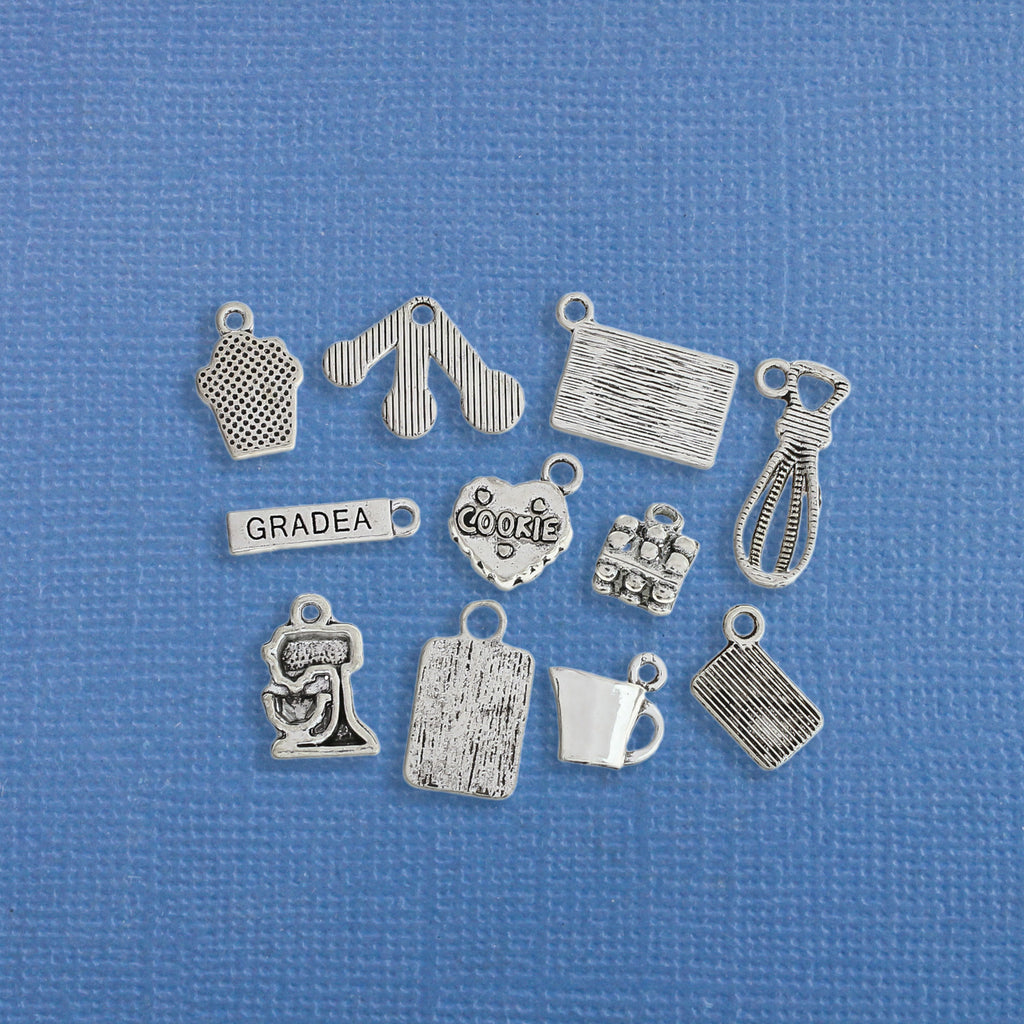 Kitchen themed collection of antique silver tone charms, in a zinc alloy metal.