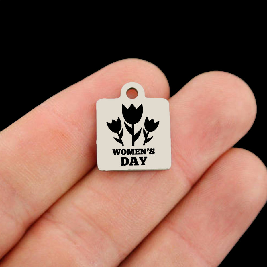 "International Womens Day" laser engraved stainless steel square charms.