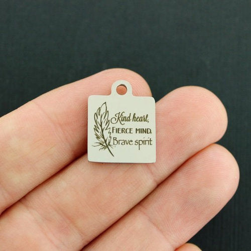"Kind heart, fierce mind, brave spirit" laser engraved stainless steel square charms with feather image, from our exclusive line designed by Bohemian Findings.
