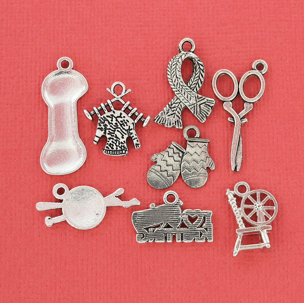 Knitting themed collection of antique silver tone charms, in a zinc alloy metal.