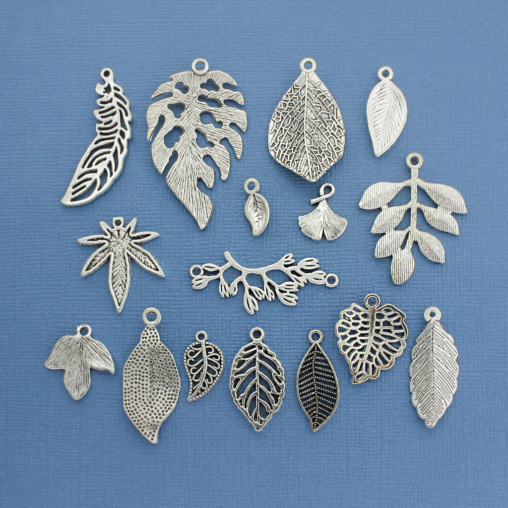 Leaf themed collection of antique silver tone charms, in a zinc alloy metal.