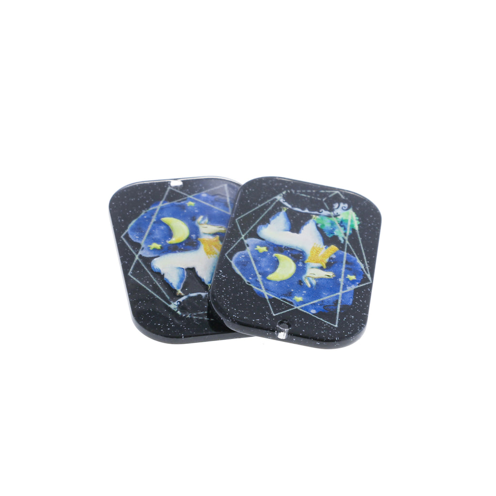Black acrylic charm with painted alpaca, crescent moon and stars.