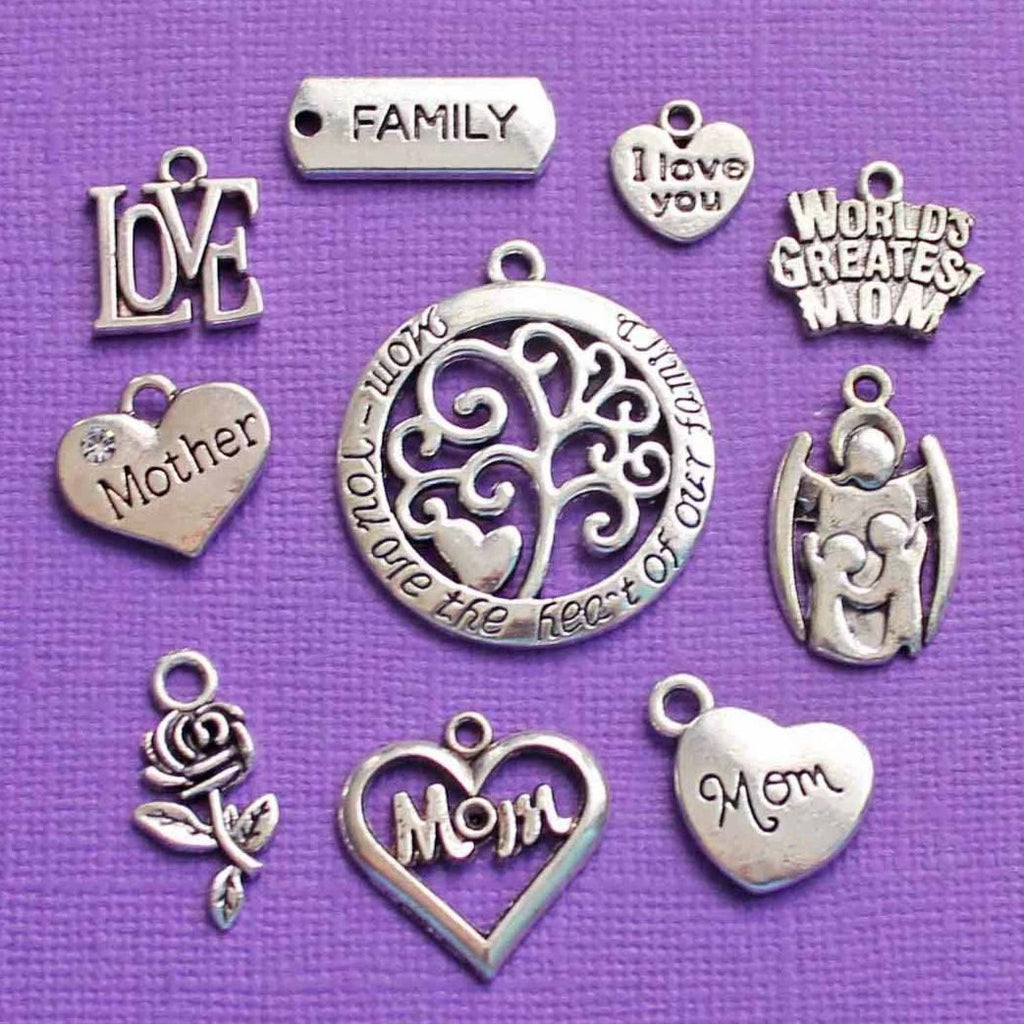 Mother themed collection of antique silver tone charms, in a zinc alloy metal.