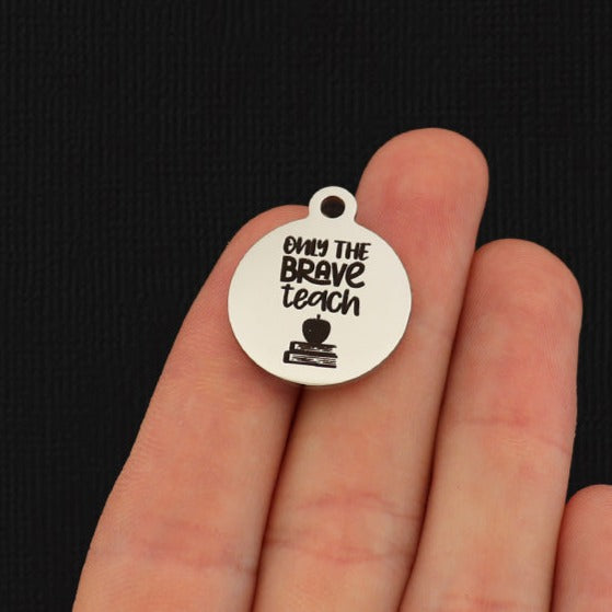 "Only the brave teach" laser engraved stainless steel round charms with apple and book stack images, from our exclusive line designed by Bohemian Findings.