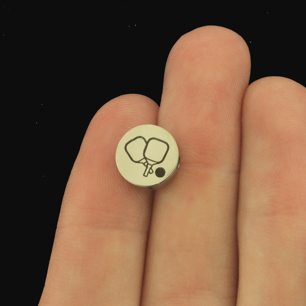 Pickleball laser engraved stainless steel beads. Choose from three sizes - 6mm, 8mm, or 10mm! Perfect to add a personalized touch to a beaded bracelet.