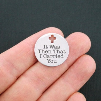 "It was then that I carried you" laser engraved stainless steel cross cutout round charms, from our exclusive line designed by Bohemian Findings.