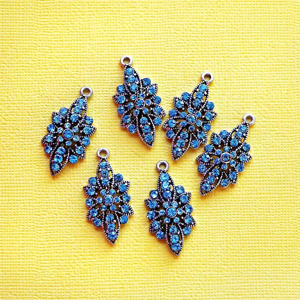 Blue rhinestone antique silver tone charms with 23 inset rhinestones, in a zinc alloy metal.