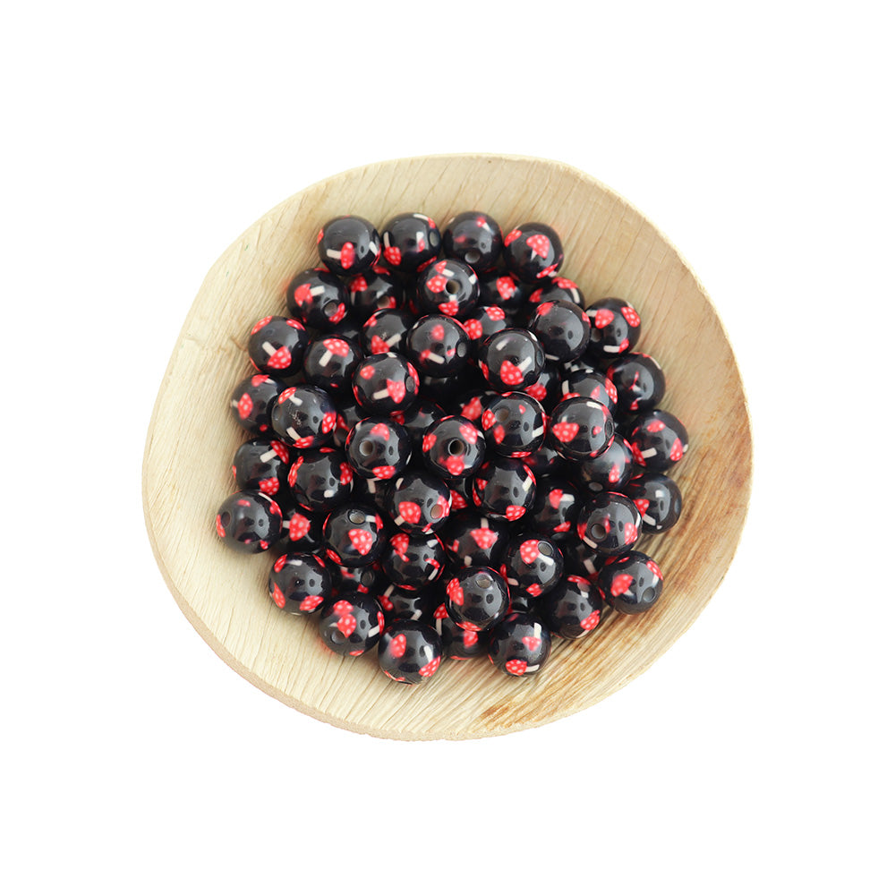 Black with red mushroom design acrylic beads in a 10mm x 9.5mm round, with a polished finish.