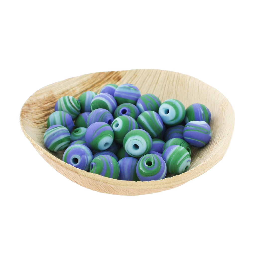 Blue and green swirl handmade lampwork glass beads in a 12mm round, with a polished finish.