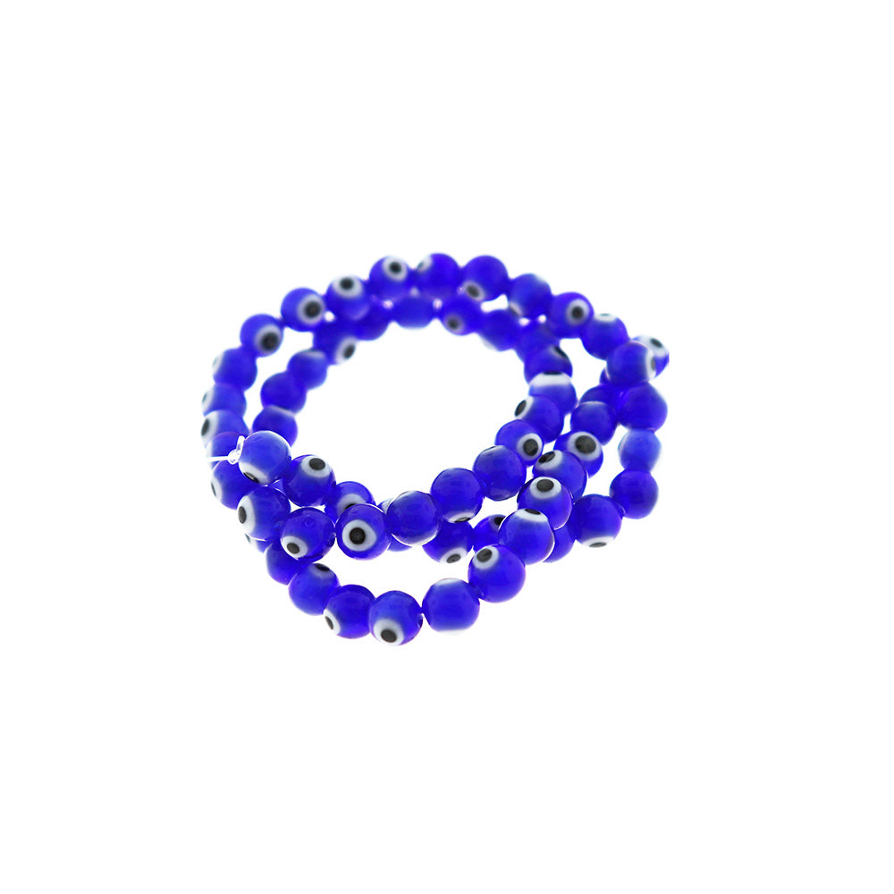 Blue, white, and black evil eye lampwork glass beads in a 6mm round, with a polished finish.