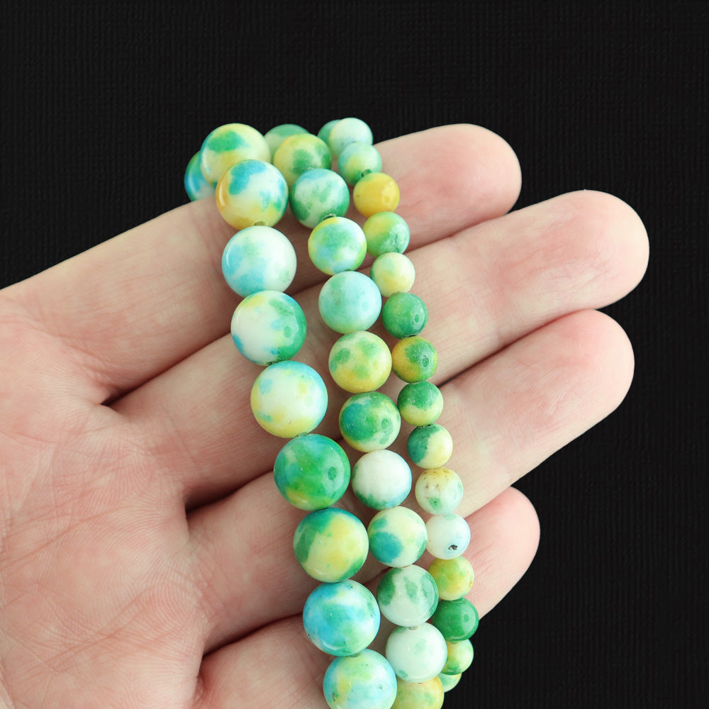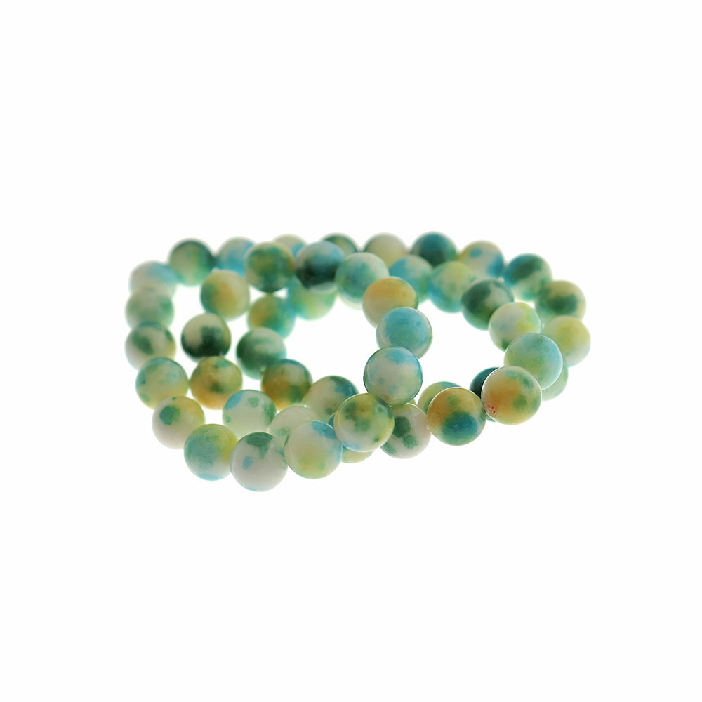 Dyed blue and green natural jade beads in a 6mm, 8mm, or 10mm round, with a polished finish.