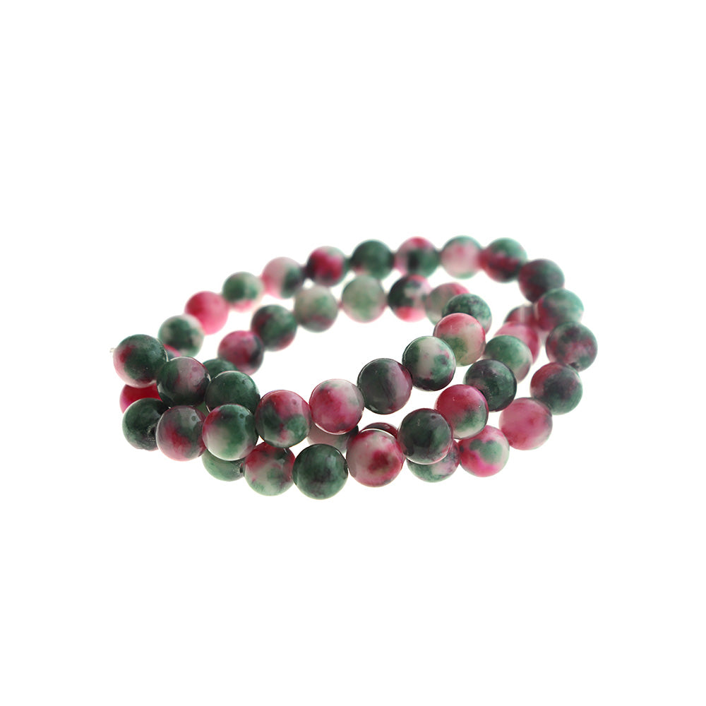 Dyed pink, green and white natural jade beads in a 8mm round, with a polished finish.