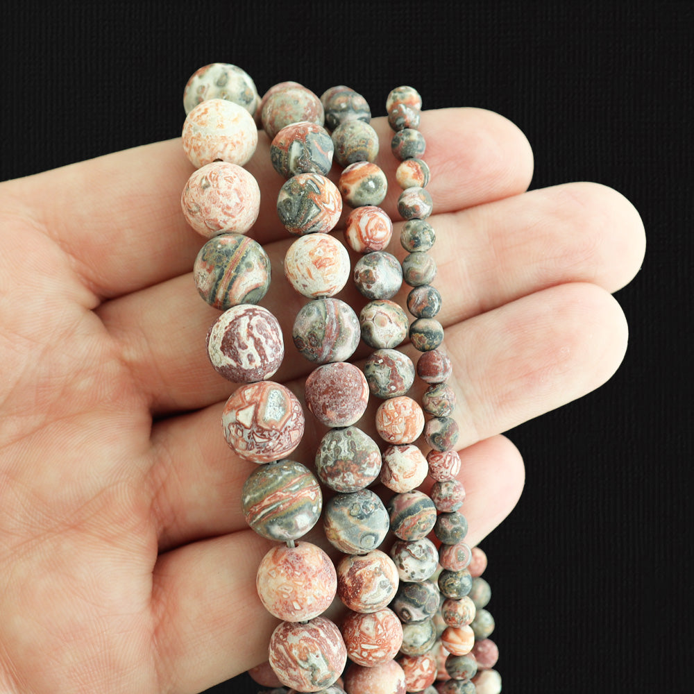 Red, brown, black and whitenaturalred leopard skin jasperbeads in a 4mm, 6mm, 8mm, or 10mm round, with afrosted finish.