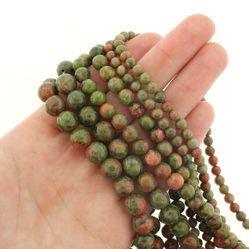 Red and green natural unakite beads in a 4mm, 6mm, or 8mm round, with a polished finish.
