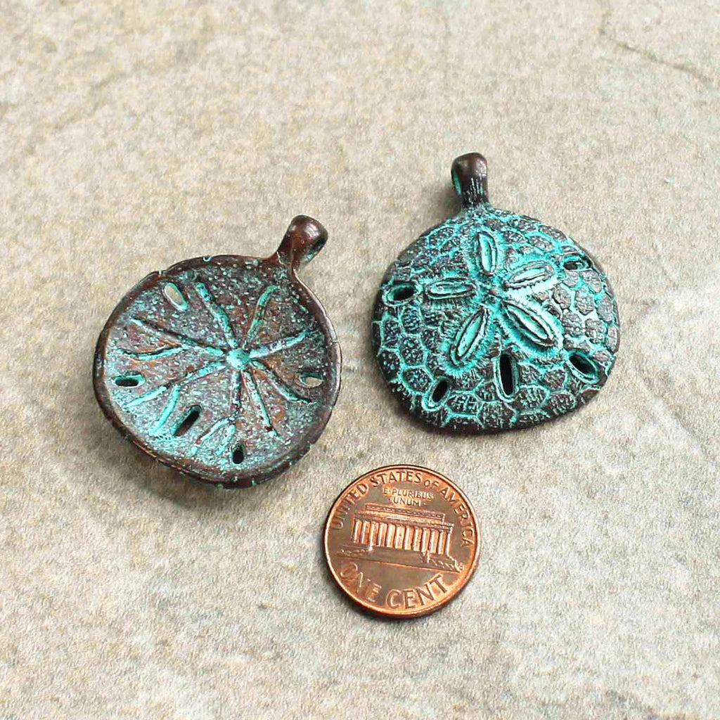 Sand dollar antique copper tone charm, in a metal alloy, plated with copper and finished with verdigris. Authentic Mykonos cast metal charms, made in Greece.