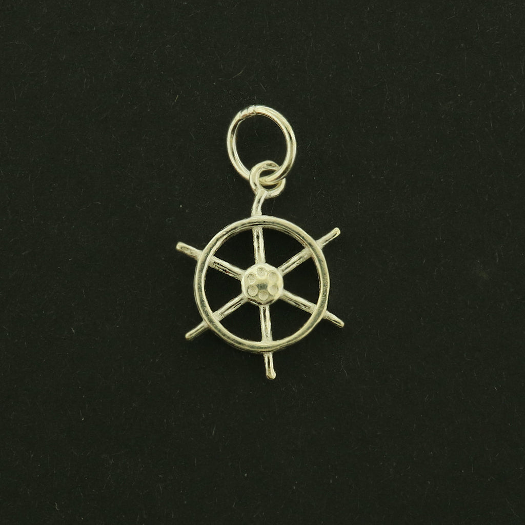 Simple ship's wheel charm made of 925 sterling silver. Includes an attached jump ring!
