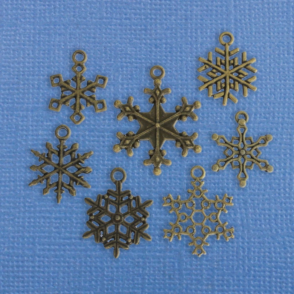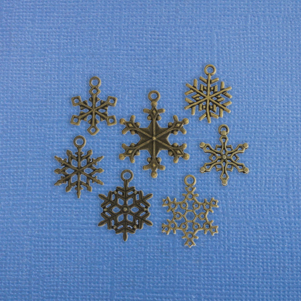 Snowflake themed collection of antique bronze tone charms, in a zinc alloy metal.