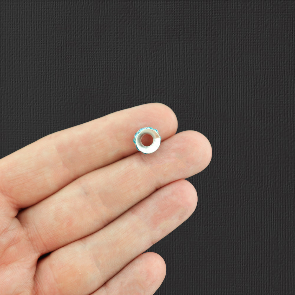 Silver tone brass beads in a 9mm x 4mm rondelle spacer, with a metallic finish with inset blue rhinestones.