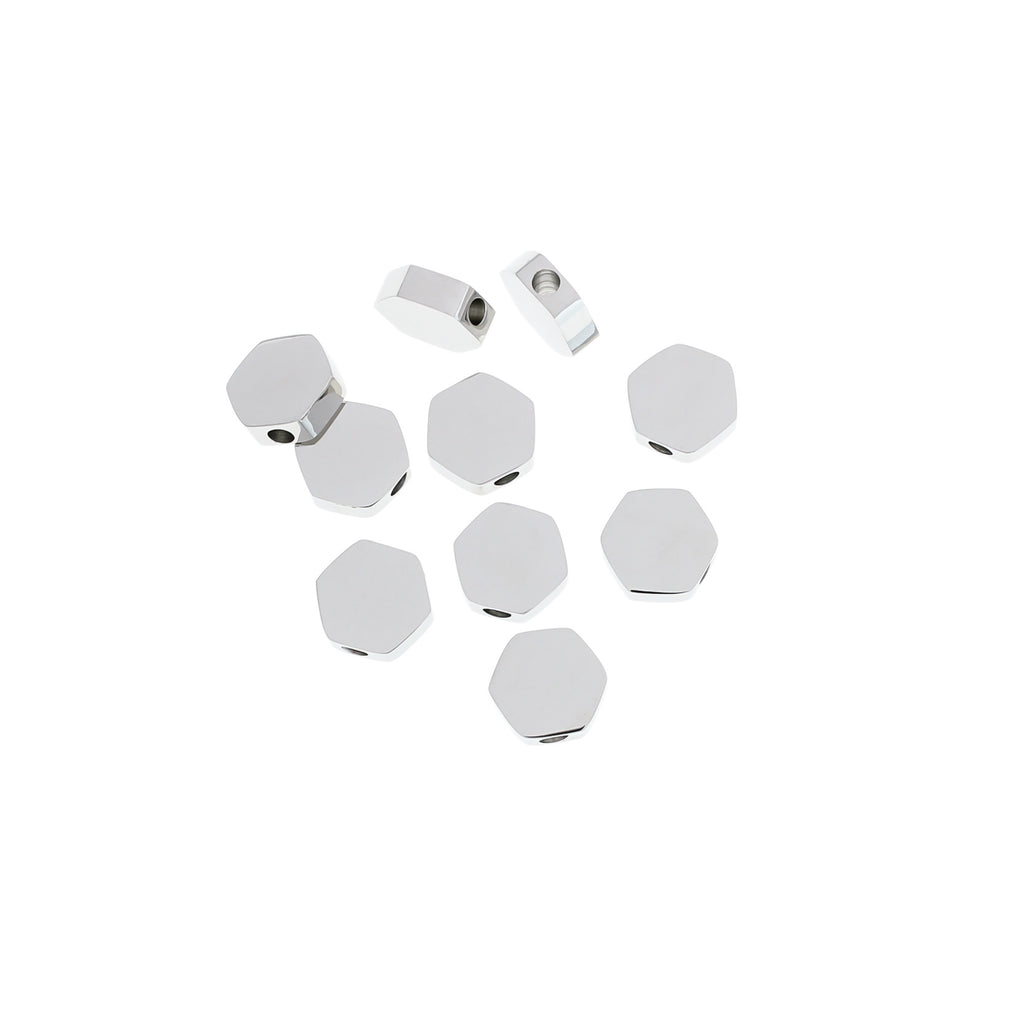 Geometric hexagon silver tone stainless steel beads in a 8mm x 8mm spacer, with a metallic finish.