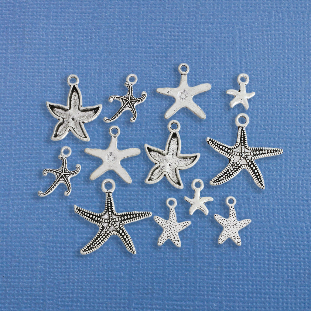 Starfish themed collection of antique silver tone charms, in a zinc alloy metal.