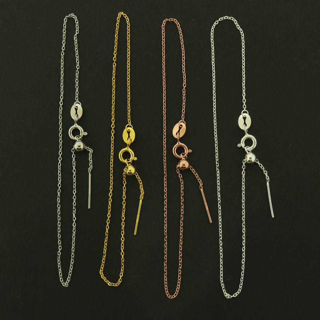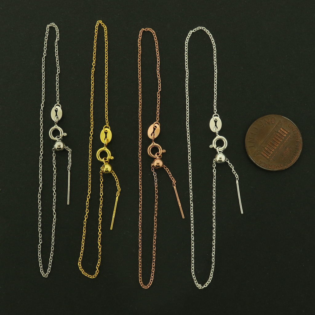 They are all 1mm thick and a touch under 7.5" long, super dainty! Each are finished with a spring clasp and a stopper bead.