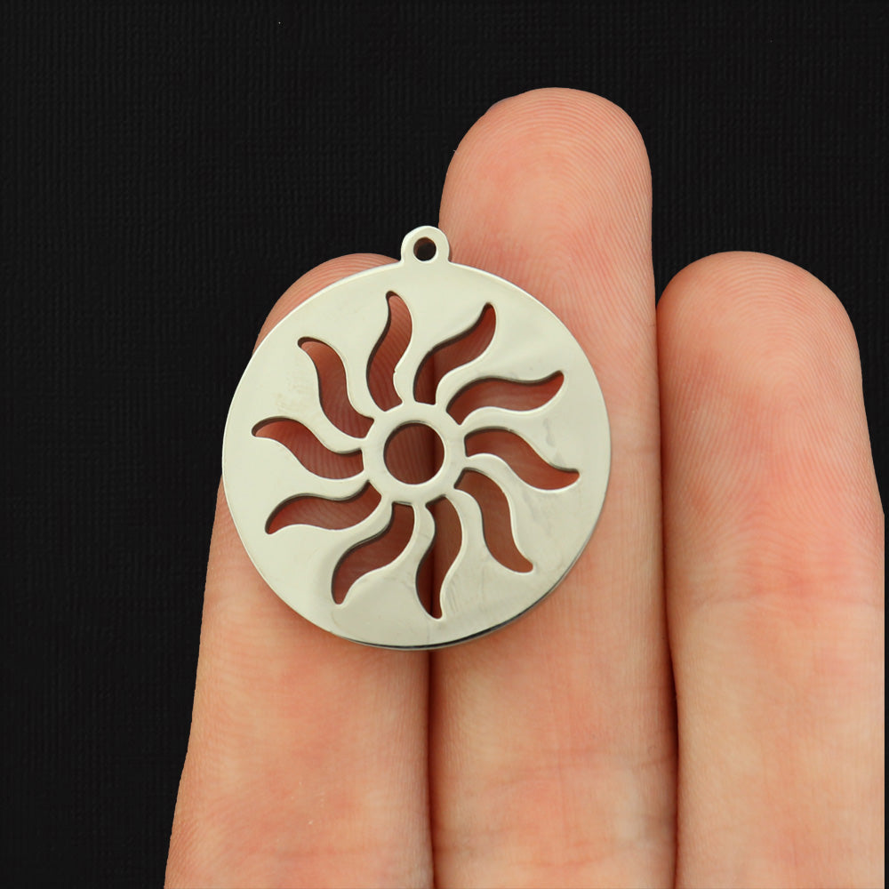 Round disc with hollow sun cut out silver, gold or rainbow tone charms, in 304 stainless steel.