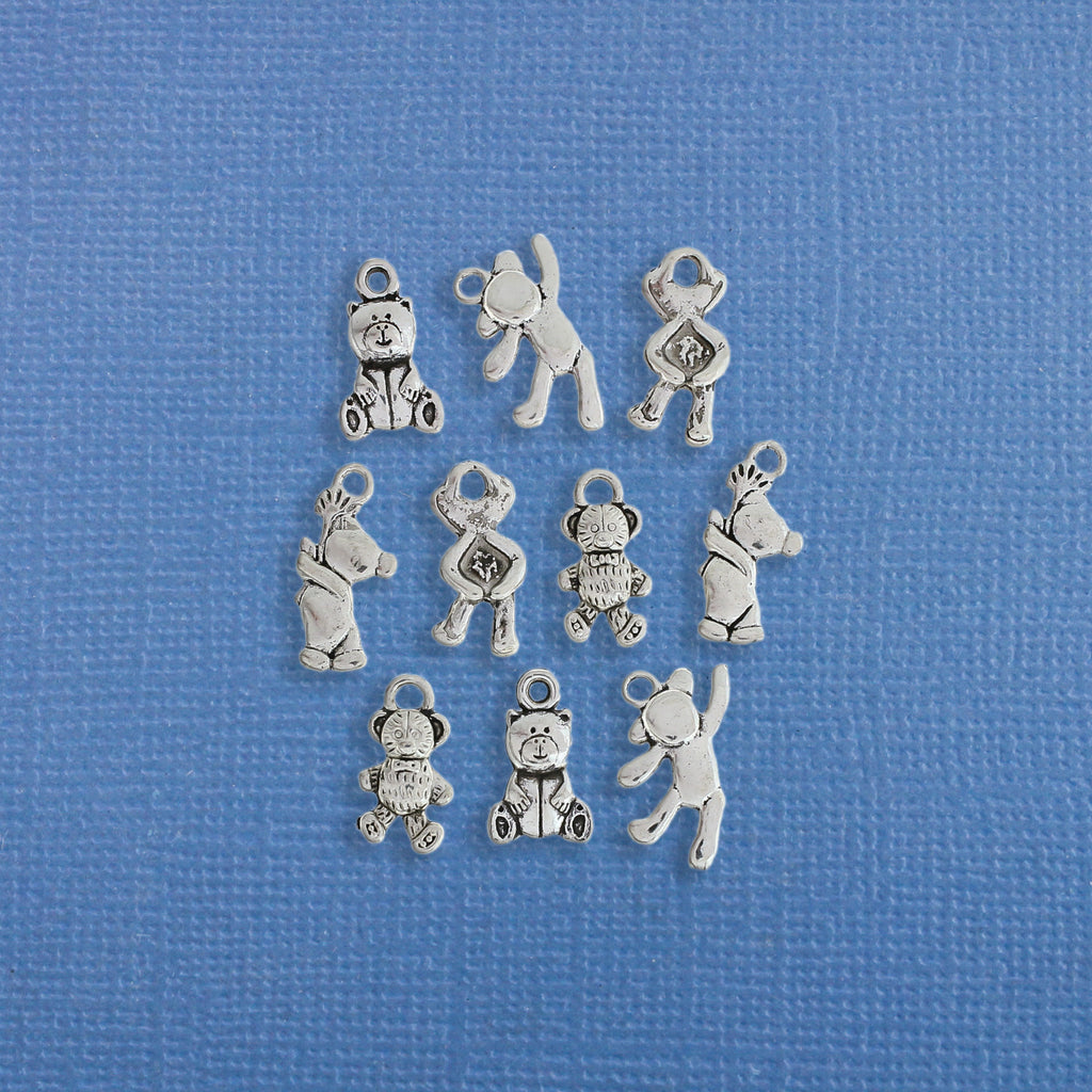 Teddy bear themed collection of antique silver tone charms, in a zinc alloy metal.