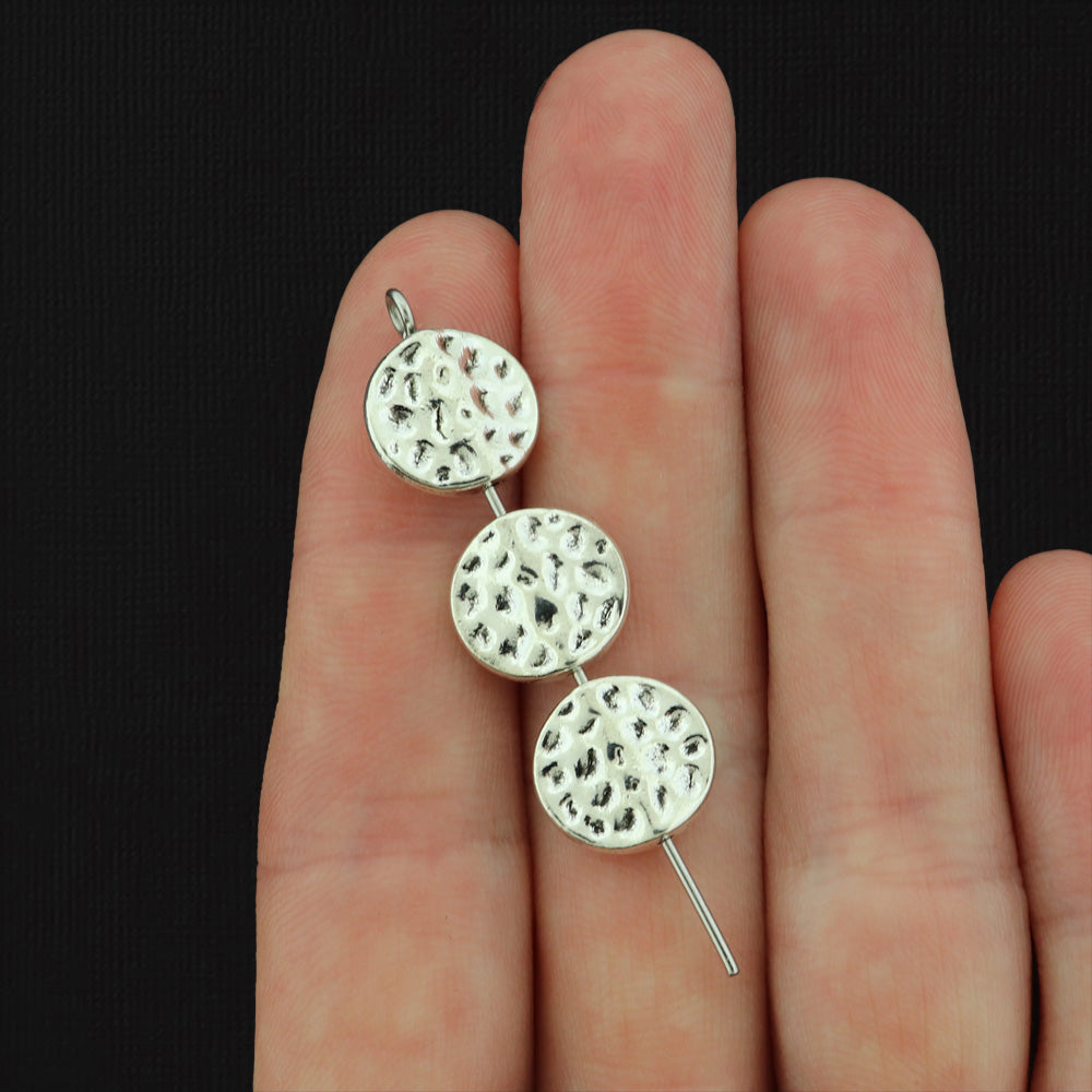 Hammered texture silver tone zinc alloy metal beads in a 11mm flat round spacer, with a metallic finish.