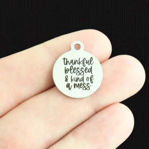 "Thankful, Blessed & kind of a mess" laser engraved stainless steel round charms, from our exclusive line designed by Bohemian Findings.