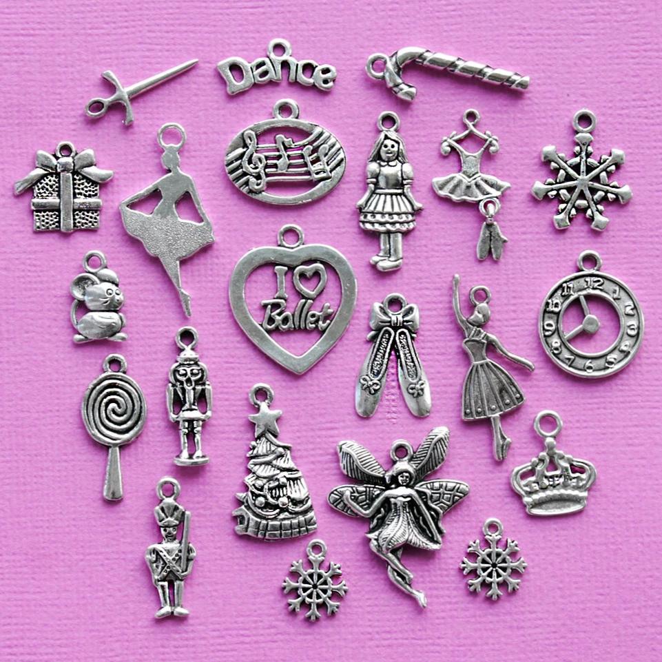 Nutcracker ballet themed collection of antique silver tone charms, in a zinc alloy metal.