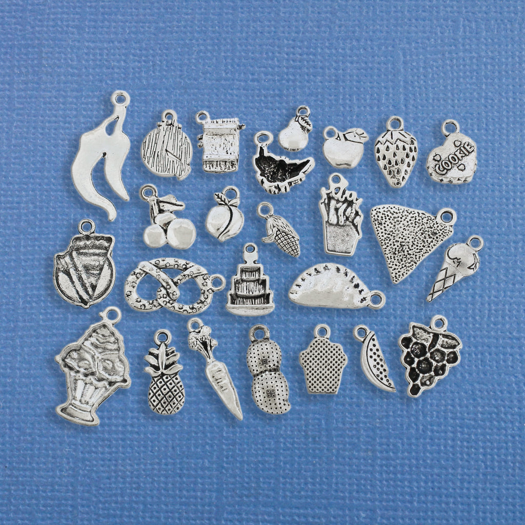 Food themed collection of antique silver tone charms, in a zinc alloy metal.