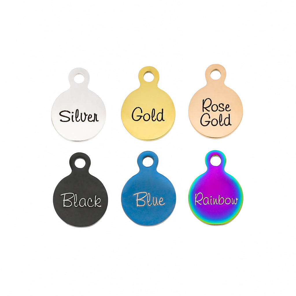 The charms are made from high-quality stainless steel, hand polished on both sides. The gold, rose gold, blue, black, and rainbow finishes are magnetically bonded with colored stainless steel to achieve a durable, permanent plating. All of our charms are hypoallergenic and won't tarnish! The design will not fade, as we don't use any aerosol paints or chemicals in our lasering process. We do all the designing and lasering right here in in our shop!