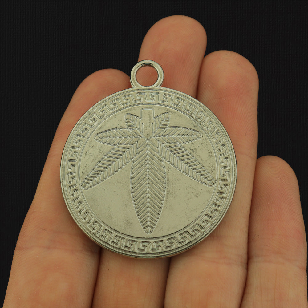 Pot leaf with black background round disc silver tone charms, in a zinc alloy metal and enamel.