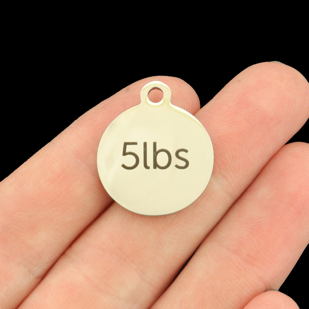 Weight loss laser engraved stainless steel round charms. Perfect to show off your weight loss journey! Choose the amount of weight from the drop-down menu. Need a different amount? Contact us and we'd be happy to set it up for you!